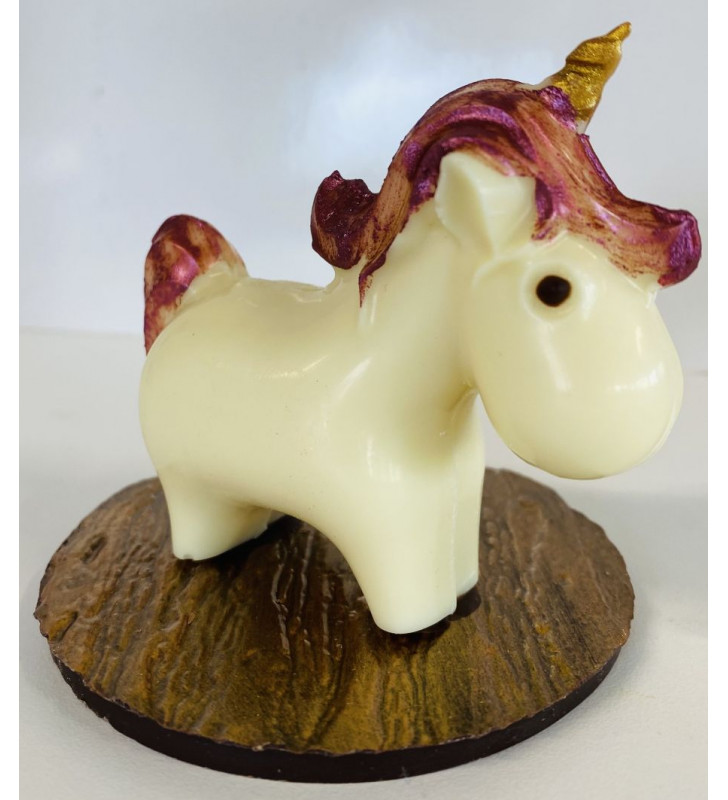 Petite tête de licorne avec un coeur sur un socle d'environ 18cm de diamètre, tout en chocolat au lait origine Vietnam (pas trop sucré avec un gout de caramel)